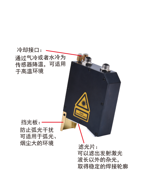 具有冷却接口(通过气冷或者水冷为传感器降温,可适用于高温环境)。 强大屏蔽功能(产品的通讯电缆、接头均采用德国知名品牌,可适应强电磁干扰环境)。 可选挡光板(防止弧光干扰可适用于弧光、烟尘大的环境)。 独特滤光片(可以滤出发射激光波长以外的杂光,取得稳定的焊接轮廓)。