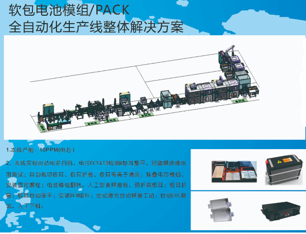 本线产能:10PPM(电芯)本线实现自动电芯扫码、电芯OCV&IR检测&极耳整平、铝塑膜绝缘电阻测试;自动裁切极耳、极耳折弯、极耳等离子清洗;堆叠电芯模组、安装固定螺栓;电池模组翻转、人工安装焊接板、预折弯极耳;极耳折弯;极耳自动滚平;安装BUM组件;自动激光自动焊接工站;自动EOL测试、人工下料。