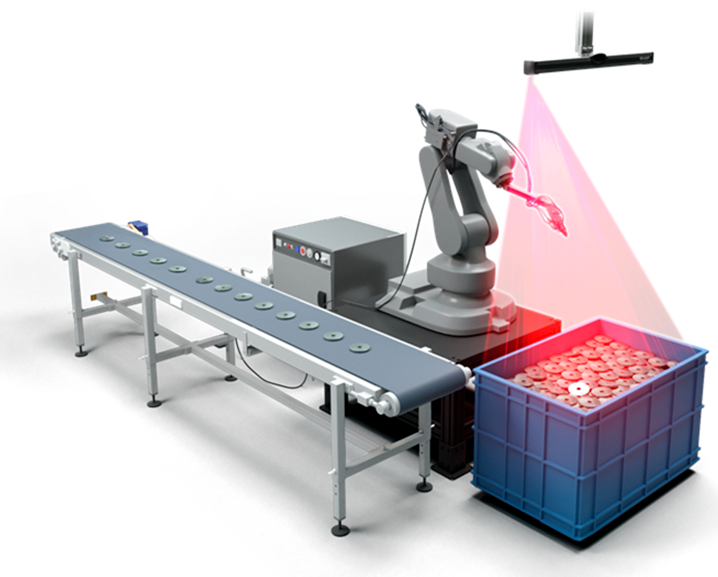 传统 2D 视觉抓取,需要做到物料大小统一,且要排列整齐,2D相机才方便识别抓取,这样下来,需要准备大量的专用托盘,而且要专门制作专用的升降机构将物品托送至合适高度。